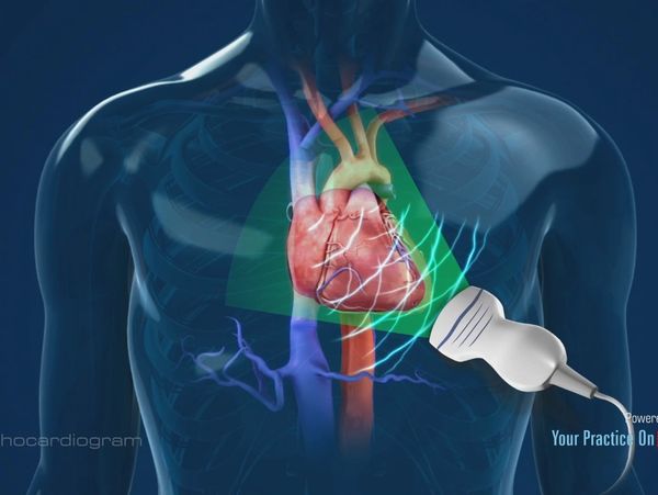 An echocardiogram is a noninvasive ultrasound that uses sound waves to create an image of the heart. It can help diagnose heart conditions like heart failure, valve problems, and congenital heart disease. A sonographer places a hand-held wand (called a transducer) on the outside of your chest to send sound waves to your heart. These sound waves bounce off the different parts of your heart creating echoes, which then appear as pictures on the sonographer's computer screen. A small amount of gel on the end of the wand, which helps produce clearer pictures and won't hurt your skin. These images are saved for your cardiologist and physician to review later. Providers often combine echo with Doppler ultrasound and color Doppler techniques to evaluate blood flow across your heart’s valves. Echocardiography uses no radiation. Occasionally you may need an enhancing agent injected through an intravenous (IV) line during the study to improve image quality.